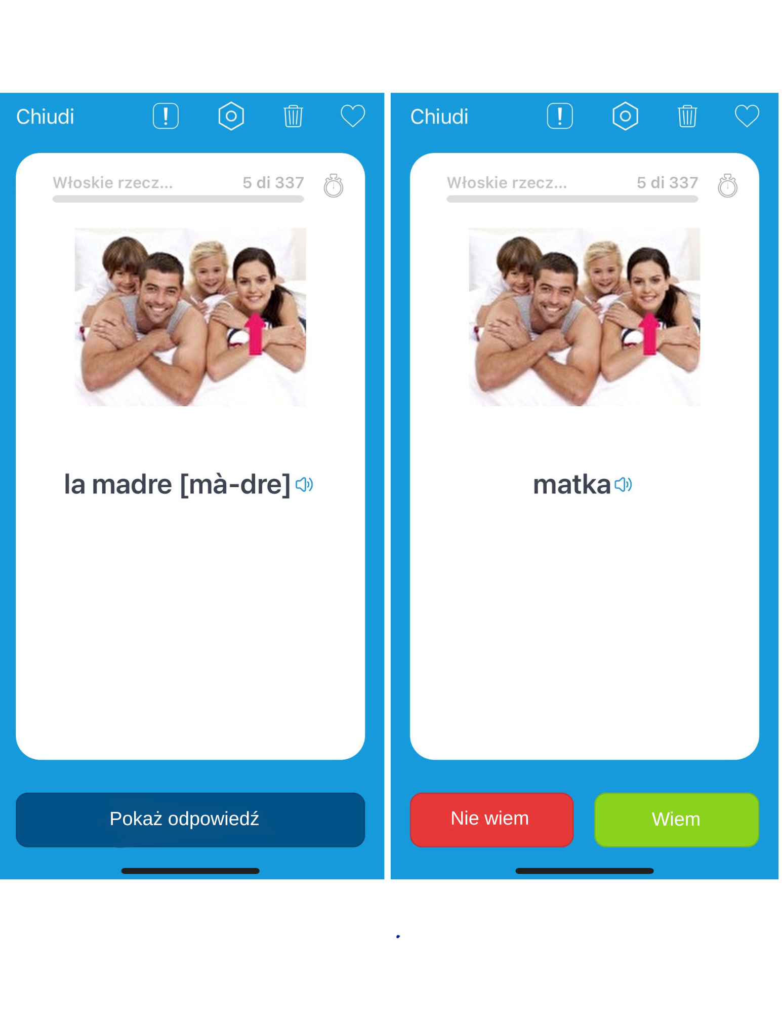 - linki do fiszek online, dostępnych na telefonie i laptopie (Android oraz iOS). Tłumaczenie polski -> włoski, a także włoski -> polski (zdj. 4),