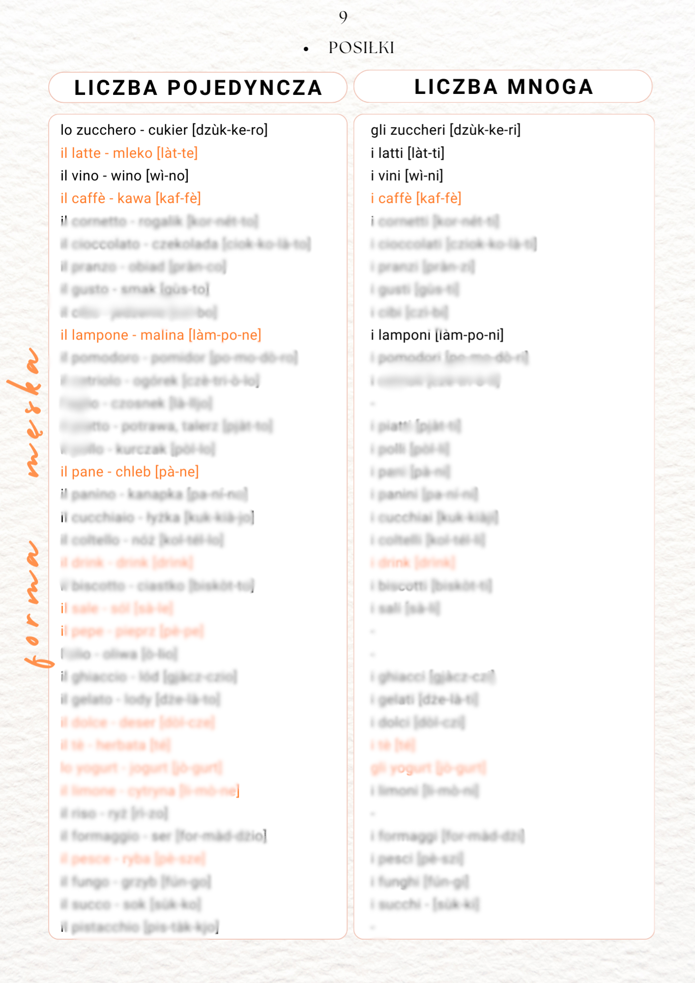 - słownictwo podzielone na kategorie, wraz z wymową oraz wyjątkami zaznaczonymi na pomarańczowo (zdj. 3 ),
